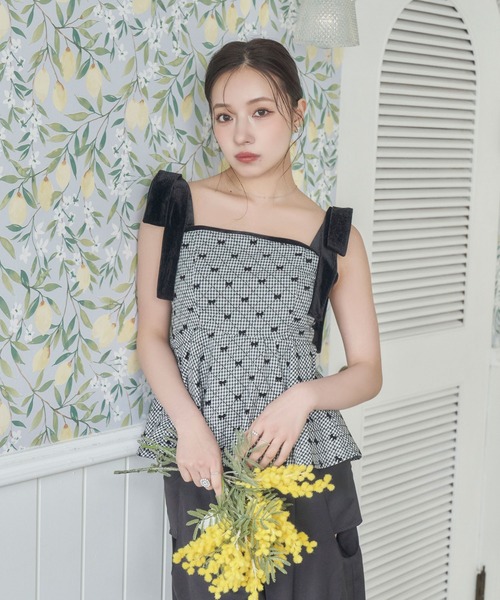 ベロア生地の肩リボンがアクセントのキャミソールビスチェ。本体もリボン柄の生地を使用しており、リボン感満載のアイテムです。