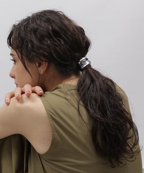 メタル素材と異素材ミックスのヘアーカフ。 シンプルなデザインで、どんなスタイルにも合わせやすいアイテムです。 髪を結んだヘアゴムにフックを差し込めば、簡単にヘアアレンジが完成します。