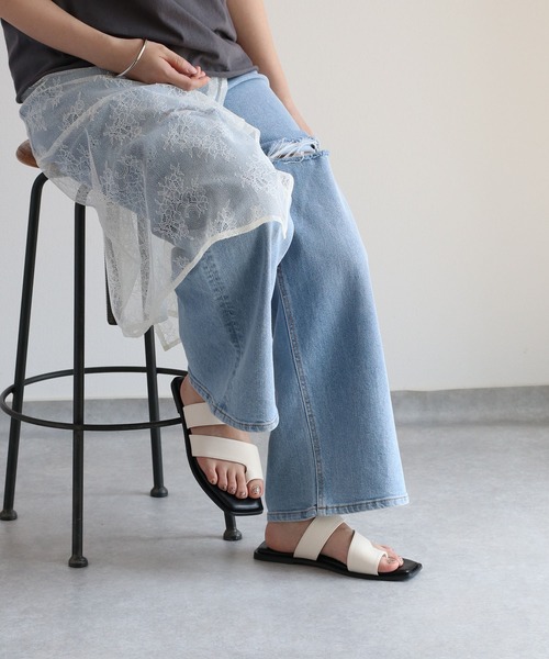 夏の定番トングサンダルをシャープで大人っぽくアップデート◇Point◇スクエアトウが全体のシルエットをシャープに見せます。やや太めのバンドでより足がスッキリ見えする効果もあり。ナチュラルに見えやすいトングサンダルが都会的な印象に仕上がっています。◇Material◇軽い履き心地。フラットなので楽ちんです。◇Coordinate◇スラックスやカラーパンツ合わせできれいめコーデ。デニムにあわせればカジュアルになりすぎず足元がしまるコーデに仕上がります。サロペットなどのイージーアイテムを大人っぽくまとめるのにも重宝します。