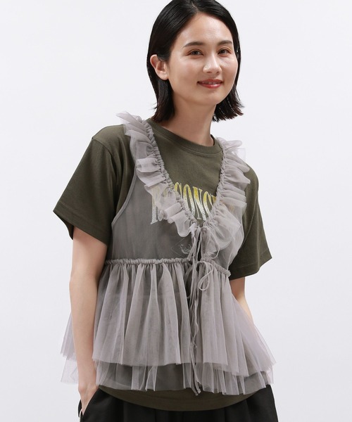トレンドのチュール素材のリボンベスト。 透け感があり軽さのあるチュール素材でどんなスタイルにも合わせやすい1点です。 同色のフリルデザインなので取り入れやすく、裾部分はギャザーデザインでボリューム感たっぷりに。 合わせるだけでスタイリングを旬に変えてくれる万能アイテムです。 【素材】 透け感があり柔らかさのあるチュール素材。 【スタイリング】 スタイリングの主役になるので、シンプルなアイテムとの相性〇