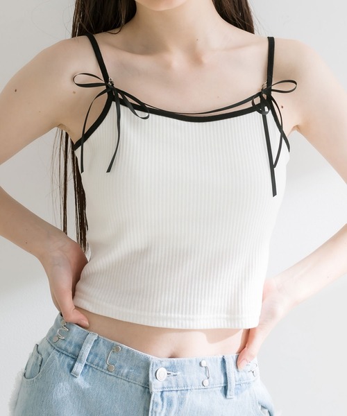 胸元のリボンがポイントのカップ付きインナー■デザイン・楽な着心地でおしゃれ見えするカップ付きインナー。・細いリボンが女性らしさを演出するデザインで、首元が寂しくならずコーデのアクセントに。・配色デザインでスポーティーな印象になります。・華奢な肩紐と、クロップド丈でヘルシーな肌見せスタイルも楽しめます。・リボンは取り外し可能なので、シンプルなインナーとしても使えます。■カラー・オフ/ピンク/ブラックの3色展開■スタイリング・カーディガンやシャツとのレイヤードコーデに最適。・ボトムスはガーリーなミニスカートや、カジュアルなパンツまで幅広く合わせていただけます。-----------------------------裏地:なし光沢感:なし透け感: なし伸縮性:あり手洗い: 可能タンブラー乾燥: 不可アイロン: 150℃まで-----------------------------model:162cm■お気に入り登録のおすすめ【気になるアイテムを登録】ハートをクリックしてお気に入りに登録すると完売カラーの再入荷やラスト1点の通知、セールの通知を受けとることができます。【ブランドを登録】新商品や再入荷、セール通知など、いち早くブランドの情報を受けとることができます。