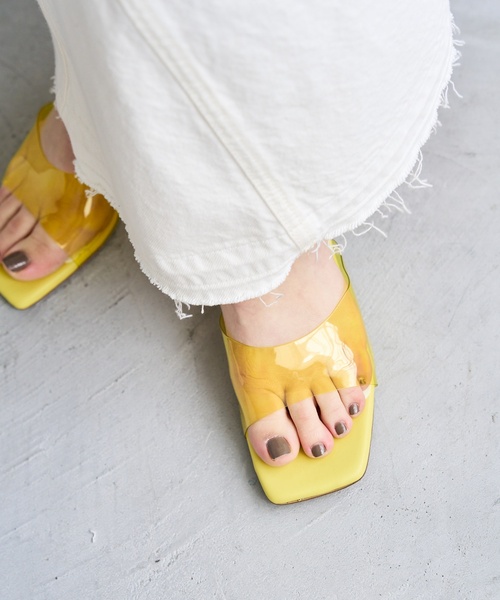 クリア素材のストラップでシーズンムードを盛り上げてくれるサンダル。ワイドスクエアのトウデザインで今年らしい足元に。ヒールは今回オリジナルでデザインし、太めながらも横顔が美しく見える様こだわりお作りしました。カラーや柄はキャッチーですがシンプルなデザインなので、見た目以上に着回しの利くアイテムです。**********************【スタッフ着用コメント】《スタッフS》普段サイズ:23.5cm/着用サイズ:Mサイズ感:いつものサイズで丁度よい履き心地:縦横共に丁度よいサイズ感でした。アッパーはPVC素材なので伸縮性はありませんが特に窮屈感はなかったです。ヒールは接地面が広いので安定感ありました。***********************柄を使用しているカラーについて、柄の出かたには個体差がございますのでご了承ください。*サイズによりヒールの高さが多少前後することが御座います。予めご了承ください。*照明の関係により、実際よりも色味が違って見える場合があります。またパソコン・スマートフォンなどの環境により、若干製品と画像のカラーが異なる場合もございます。*商品の色味は、商品アップ画像をご参照ください。