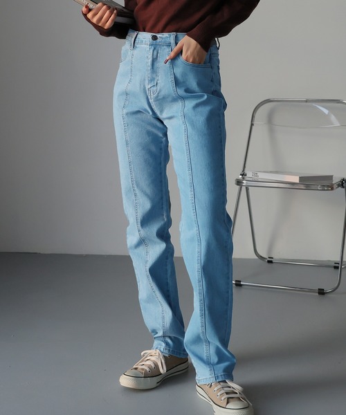 《センターラインですっきり魅せ》 ■デザイン ・ポケット口から裾にかけてのセンター切り替えが 足を長くほっそリと見せます。 ・履きこみの深いハイウエストと程よいストレートシルエットは トレンド感のあるシルエットです。 ■素材 程よい厚みのあるデニム生地 ■スタイリング どんなトップスにも合わせやすい定番デニム ボーダーT×トレンチコートと合わせると フレンチスタイルに とことんカジュアルに仕上げたい日は トレーナー×スニーカー合わせがおすすめ◎ シャツやブラウス、コンパクトなリブニットなどとも相性抜群 ------------------------------ 伸縮性:あり 透け感:なし 裏地:なし ------------------------------ ------------------------------ 【スタッフが着用しました!】 身長:161cm 普段着用サイズ:M~Lサイズ 今回着用サイズ:Lサイズ ・着用感 フロントラインがポイントに脚をスッキリ見せてくれます。 ストレッチも効いていて履き心地抜群。 足首までの長め丈でスニーカーも合わせやすいデザイン◎ ------------------------------