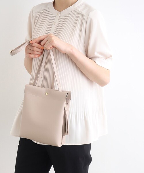 【デザイン】柔らかい軽量のフェイクレザーを使用した、3層に分かれたショルダーバッグです。スクエアのシンプルフォルムでスタイリングい合わせやすく、口が大きく開くの収納しやすいです。軽くてお出かけに便利なサイズ感とポイントでサイドにタッセルが2個付いています。ブラック以外のレザー調の裏面はメタリックになっているので、内装もポイントです。※ポケットなし※照明の関係により、実際よりも色味が違って見える場合があります。また、パソコン・スマートフォンなどの環境により、若干製品と画像のカラーが異なる場合もございます。店舗へのお問い合わせ商品番号:769-09018●製品寸法:00:高さ22cm 幅(上部)20cm 幅(下部)19cm マチ6cm ショルダー対応サイズ64~120cm備考:重量:約270g(サンプル重量)