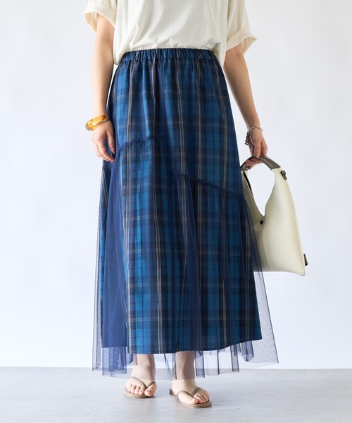 上品な大人スタイルにぴったりな控えめチェック柄商品ポイント・彩度の落ち着いたチェックにチュールを重ねたスカート・チュールを重ねていて、ふんわりボリュームシルエット・ウエスト総ゴムで着心地バツグンおすすめコーディネート甘すぎないテイストで、シンプルなサマーニットや無地T、ブラウスとも相性バツグン!足元はサンダルから、スニーカーとも相性良し!おすすめスタイリングアイテム光沢シアーシャツバンザイニットドルマンシャツロードフォトTee素材柄部分:ポリエステル65%、コットン35%チュール部分:ポリエステル100%洗濯方法:洗濯機洗い(標準)透け感:柄部分なし裏地:なし伸縮性:ややあり生地の厚さ:普通光沢:なしポケット:なし【スタッフ着用コメント】《RINO》身長:148cm/着用サイズ:F体型:普通/骨格:ストレート/パーソナルカラー :ブルベ冬チェック柄にチュールを重ねたモードなスカート♡チュールの切替が他とはかぶらないポイントに!《KAREN》身長:162cm/着用サイズ:F体型:普通/骨格:ストレート/パーソナルカラー :イエベ春チュール×チェック柄のデザインスカートです。コーデの主役になります◎《あおい》身長:160cm/着用サイズ:F体型:普通/骨格:ウェーブ/パーソナルカラー :ブルべ冬今の季節から秋冬まで着れるスカート。ウエストゴムで楽に着れます!骨格タイプ骨格ストレート:全体的に立体型で筋肉質。ひざ下はすらっと細め。ボディラインにメリハリがある。骨格ウェーブ:上半身が薄く、華奢。緩やかな曲線のボディライン。下半身に重心があり女性らしい体型。骨格ナチュラル:筋肉や脂肪があまり感じられない体型。腰の位置が高く骨や関節が目立ちやすい。============================【注意点】※画像の商品は光の照射や角度、お使いのモニター環境により、 実物と色味が異なる場合がございます。 あらかじめご了承下さいませ。============================【お買い物をもっと便利に楽しく♪】『♡』をクリックでお気に入り登録・「商品のお気に入り登録」で・・・ラスト1点や再入荷の通知が届きます。登録して頂いた商品だけが対象となる、あなただけのタイムセールが開催されることも!・「ブランドのお気に入り登録」で・・・新商品や再入荷など、いち早くブランドのお得な情報を受け取ることができますので、ご登録をおすすめします! ============================