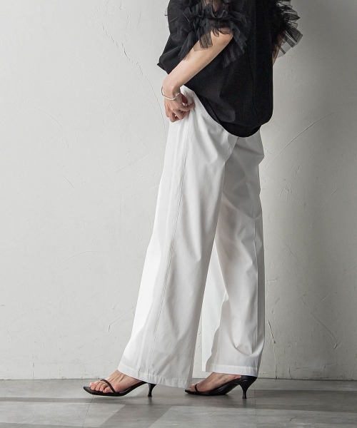 ハンサムでスタイリッシュな美脚が叶う、サイドラインのワイドパンツ。きれいめのスラックスに、スポーティなサイドラインを組み合わせた、今っぽいモードさを感じる一本です。広がりを抑えたワイドシルエット。後ウエストゴムは脇から離し、開きにくいポケットにすることで、ポケットにすることで、腰回りをすっきりと見せるパターンに仕上げています。【スタイリング】スタイリングパンツのサイドラインを活かした、シンプルベースのシャツやカットソーでハンサムな着こなしがおすすめです。【素材の特徴】日常撥水・防汚加工を施した、オリジナル素材。ドライタッチで軽量、抜群の伸縮性で快適な着心地を叶える、ストレッチナイロン。【同シリーズ】2111-43013 WATERREPELLENTコクーンスカート----------------------------------洗濯方法家庭洗濯:液温は40℃を限度とし、手洗いが出来る。自然乾燥:日蔭の吊り干しがよい。アイロン:底面温度110℃を限度としてアイロン仕上げができる。ドライクリーニング:石油系溶剤による弱いドライクリーニングができる。----------------------------------■モデル身長 166cm 170cm /着用サイズ M※画像の商品はサンプルとなりますので実際の商品と仕様、加工、サイズが若干異なる場合がございます。※お客様のモニター環境により実際のお色と多少異なる場合がございます。※撮影状況や光の当たり具合により、色合いが異なって見える場合がございます。----------------------------------▼商品のお気に入り登録ハートマークをクリックし、お好きなカラーを選んでお気に入りに登録完売カラーの再入荷通知や、ラスト1点の通知、セールの通知も受け取ることができます。▼ブランドのお気に入り登録新商品や再入荷等、いち早くブランドのお得な情報を受け取ることができます。----------------------------------