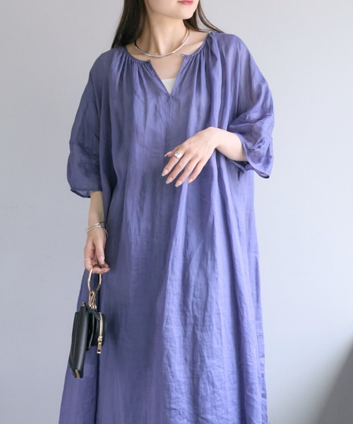 ピュアルセシン 2024 SS collection【American Classic Vintage】 ◇見た目にも涼し気なラミーリネンワンピース◇ ●商品のお気に入り登録 クーポンやタイムセール、再入荷通知やラスト1点などお得な情報を受け取ることができます。 ご登録をお忘れなく◎ ●デザイン ラミーリネン独特の風合いと透け感が魅力のワンピース。 肘が隠れる長めの袖丈で着になる二の腕まわりもカバーしてくれつつ、通気性が良いので涼しさもキープしてくれます。 襟元から裾に掛けてギャザーを寄せて華やかな印象に。 生地をたっぷりと使用していますが、リネン生地なので 着こむごとに身体に馴染んでいきます。 そういった経過も楽しんで頂ける大人の女性の夏ワンピースです。 ベーシックなカラー展開なので カラーパンツとのレイヤードやストール等の小物使いも映える一着。 一枚で様になり着心地も快適なので、夏場にあると安心な頼れるアイテムです。 ●スタイリング 薄手で程よい透け感があるワンピースなのでインナーは必須です。 デニムパンツとスニーカーでカジュアルなスタイリングから、 ワンピースとして着るときは グルカサンダルやトングサンダル等のボリューム感のある足元にすると好バランスです。 ●素材 シャリ感のあるラミー素材は肌に張り付かず、サラリとしているため 汗ばむ暑い夏でも快適に過ごせます。 =============================== 透け感:あり 伸縮性:なし 光沢感:ほのかにあり 生地の厚さ:薄手 【スタッフコメント】 年齢:20代後半/身長:158cm/普段着用サイズ:Mサイズ サイズ感:ゆったりとした着心地で窮屈感はまったくありません。 足首が見える長さなので、ローヒールの靴でも安心して着用できます。 ロング丈のワンピースですが 裾巾がたっぷりとあるので、風通しも良く夏は快適に着ることが出来そうです。 =============================== ※着用、お取り扱いの際は、商品についている品質表示とアテンションタグを必ずご確認下さい。 ※撮影場所やお使いのモニター環境により若干お色味が異なる場合がございます。特にロケの撮影では明るく見える傾向にございます。 ※予約商品はサンプルで撮影をしております。若干の仕様が変更になる場合がございますので予めご了承の上ご注文くださいますようお願いいたします。