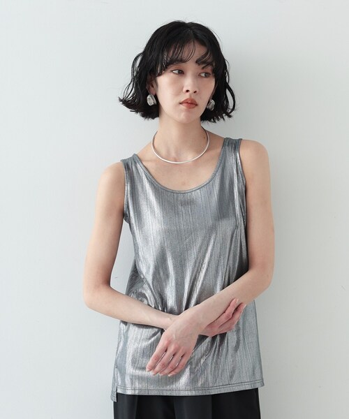 Design Pointコーディネートを格上げする華やかな箔ラメタンクトップ。細かなランダムリブに、箔ラメプリントを施した上品さと華やかさのある一枚です。リブ地にプリントすることでのっぺりした印象にならず、さり気なく縦のラインを強調しスッキリ見せてくれます。衿ぐり・袖ぐりラインにこだわり、着回ししやすいタンクトップ。Styling Pointシアーブルゾンやシャツなどの羽織のインやデザインパンツのカーゴパンツやバレルパンツとも相性良く◎。Fabric Point箔プリントを施したストレッチジャージ。※照明の関係により、実際よりも色味が違って見える場合があります。また、パソコン・スマートフォンなどの環境により、若干製品と画像のカラーが異なる場合もございます。店舗へのお問い合わせ商品番号:523-18049●製品寸法:38(M):着丈65cm B88cm 肩幅30cm 裾幅50cm備考: