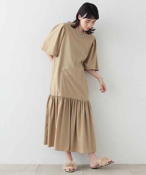 Design Point 甘めのティアードディティ―ルを取り入れたマキシワンピース。 トップはシンプルなデザインにすることで、甘めを軽減しシャープな印象に。 身体のラインを拾わないIラインシルエットでモード感をプラスしています。 Styling Point サンダル合わせでリゾートスタイルに、スニーカーを合わせて普段着のカジュアルスタイルにと、足元ひとつでスタイリングの幅が広がります。 Fabric Point 細番のエコナイロン糸を使用し、適度なバランスで織り上げた平織素材。 最大の特徴は軽さです。 サステナブル素材、トレンドの表情感、軽さを併せ持つテキスタイルです。 ※照明の関係により、実際よりも色味が違って見える場合があります。また、パソコン・スマートフォンなどの環境により、若干製品と画像のカラーが異なる場合もございます。 店舗へのお問い合わせ商品番号:523-58033 ●製品寸法: 36(S):着丈128cm B103cm 袖丈33cm 肩幅40cm 裾幅128cm 38(M):着丈130cm B106cm 袖丈34cm 肩幅41cm 裾幅132cm 備考: