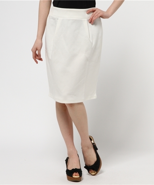ストレッチがきいたポンチ素材のタックタイトスカートです。ウエストはバックのみのゴムなのでスッキリと着用でき、シンプルでモードな印象です。きちっとしたアイテムとのコーディネートがお勧めです。