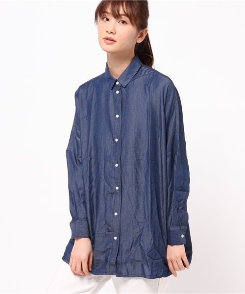 デニム素材の大きめサイズのシャツです。スタンダードな形なのですが、おしりまですっぽり隠れるビックサイズです。表面は少し光沢感があり、さらっとした肌触りです。細めのパンツと合わせたコーデをオススメします。