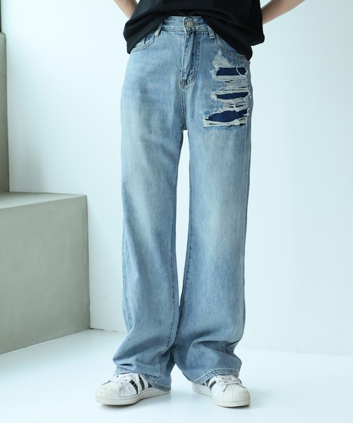 《こなれ感あふれるダメージデニム》 ■デザイン ダメージ加工を施し、こなれ感のある雰囲気に◎ ワイドシルエットでルーズな着こなしが今年らしいアイテム。 ■素材 やわらかいデニム生地 ■スタイリング カジュアルなアイテムなのでシャツブラウスやヒール等のレディライクなアイテムとのミックスコーがおすすめ。 ショート丈トップスでバランスよくまとめても可愛い♪ ------------------------------ 伸縮性:ややあり 透け感:なし 裏地:なし ------------------------------ ------------------------------ 【スタッフが着用しました!】 身長:161cm 普段着用サイズ:M~Lサイズ 今回着用サイズ:Mサイズ ・着用感 やわらかい生地でフィットする履き心地◎ カジュアルデニムなのでサンダルやミュールで抜け感を出すのもピッタリ。 ------------------------------