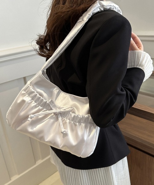 リボンポイントショルダーバック光沢感のある素材を使用し、手触りが良く上質で高見えします。立体のリポンのワンポイントに、ストラップのクシュっと感で甘さをプラス!ファスナー付きなので、開け閉めしやすいのも嬉しいポイント。フロントにはスナップボタンで収納スペースがあり、たっぷり大容量で普段使いにぴったりです。今っぽいショルダータイプで、あらゆるコーデと合わせて活躍してくれます。……………………厚 さ: ふつう伸縮性:なし透け感:なし裏 地: あり季 節: 春/夏モデル身長:160cm(着用サイズ:フリー)生産国: China……………………★お買いものをよりお楽しみいただく為に!★◆商品のお気に入り登録お気に入りアイテムの完売カラーの再入荷通知や、ラスト1点の通知、セールの通知も受け取ることができます。◆ブランドのお気に入り登録新商品や再入荷など、クーポン配布などのお得な情報を受け取ることができます。※商品画像は撮影時の光や角度により、実物の色味と異なって見える場合がございます。※撮影はサンプル品を使用しており、表示のサイズ感も実物とは若干異なる場合もございますので、予めご了承ください。※生産時期により色・素材・サイズ感など多少異なる場合がございます。予めご了承ください。