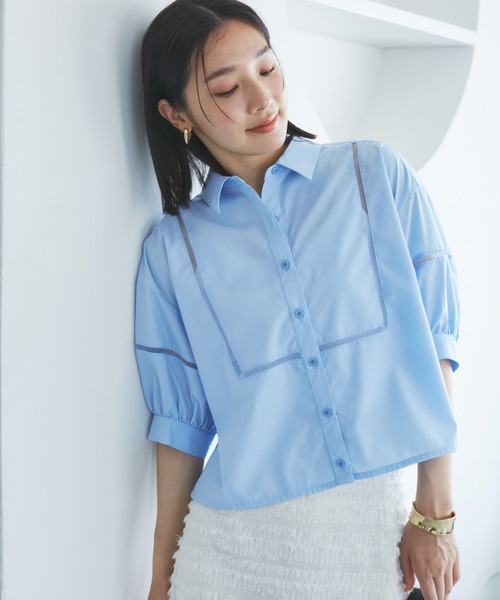 レース切り替えが可愛い!トレンドのクロップドシャツ◆2024春夏◆ 【デザイン・シルエット】 身頃と袖のレース切替がポイントのクロップドシャツ。 <POINT> ・ボクシーなシルエットとシャツ襟に対して少し肩を落とした丸みのある袖やレースで甘さをプラスした大人なレディアイテム。 ・レース切り替え部分が涼しげな印象を与えます。 ・袖は5分袖のため、シーズンも長く着用可能。 ・クロップド丈ですが、短すぎずバランスも取りやすい丈感。 【素材】 やや張りのあるシャツ生地。 忙しい中でもシワになりにくく、気軽に洗濯機洗いができるイージーケア商品。 【カラー】 無地でホワイト・サックス・ストライプで柄グリーンで3色展開。 【おすすめのスタイリング】 前釦を開けてワンピースなどの羽織としても着用いただけます。インナーは短丈アイテムが今年らしい! ショートパンツやワイドボトム、カジュアルにデニムアイテムとの相性は◎ ----------------------------- 裏地:なし 光沢感:なし 透け感:ややあり(ホワイトのみ) 伸縮性:なし ボタン:あり(開閉可) 生地の厚さ:やや薄手 季節:春、夏、初秋 ----------------------------- 【モデル着用サイズ】 全色モデル身長:160cm、着用サイズ:F ※画像の商品はサンプルです。 実際の商品と仕様、加工、サイズが若干異なる場合がございます。 ※重量はサンプルFサイズの測量になります。サイズによって多少異なる場合があります。 ※画像によっては実際の色味と異なる場合があります。正しい色味は生地アップ画像をご確認ください。