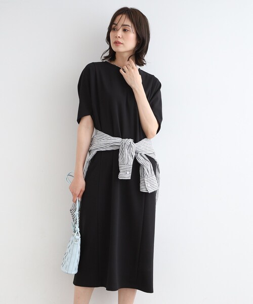 【デザインポイント】 トレンドであるドルマンスリーブをアレンジしたデザインTワンピースです。 ジョーゼット調の表面感荷のあるジャージを使用し一枚着としても様になる、きちんと見えもする印象に仕上げました。 Iラインシルエットにすることであくまですっきりとシックに大人っぽい印象を演出します。 切替位置を中心に寄せることでドルマンでも視覚的にすっきりと、縦ラインを強調するようこだわっています。 Tワンピ感覚で気軽に着用でき、着るだけでニュアンスの出る夏に便利な一枚です。 ※ポケットなし 【スタイリングポイント】 一枚で様になる便利アイテムです。 今年はシャツなどを首周りに巻いたり羽織ったり、腰に巻いたりすることでこなれ感をプラスするのもおすすめです。 バッグやネックレスなどの小物でアクセントをプラスするのも〇 足元をスニーカーやサンダルにすることでよりデイリーなスタイルになります。 【素材ポイント】 梨の皮のような細かい凹凸感のある表情と、ふっくらとした優しい風合いが特徴のアムンゼンジャージになります。 ストレッチ性を持った快適な着心地に、シワになりずらいイージーケア性を兼ね備えた素材になっております。 ※裏地なし ※この製品は、太陽光線中の紫外線(UV)を通しにくくします。この効果は永久的ではありません。 ※照明の関係により、実際よりも色味が違って見える場合があります。また、パソコン・スマートフォンなどの環境により、若干製品と画像のカラーが異なる場合もございます。 【生地詳細】 透け感:なし 伸縮性:あり 生地の厚み:普通 裏地:なし 洗濯方法:洗濯機洗い可 モデル情報:身長167cm B79 W59 H87 着用サイズ:38(M) 店舗へのお問い合わせ商品番号:127-58018 ●製品寸法: 03(XXXS):着丈99cm B88cm 袖丈30cm 肩幅29cm 05(XXS):着丈101cm B91cm 袖丈30cm 肩幅30cm 13(LL):着丈113cm B111cm 袖丈34cm 肩幅37cm 15(3L):着丈113cm B115cm 袖丈35cm 肩幅38cm 19(5L):着丈114cm B123cm 袖丈35cm 肩幅39cm 34(S):着丈109cm B93cm 袖丈31cm 肩幅31cm 38(M):着丈111cm B99cm 袖丈32cm 肩幅33cm 備考: