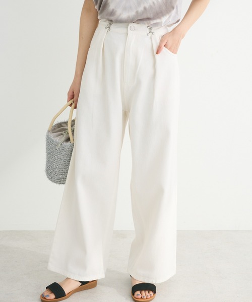 ウエストに寄せられたタックが立体的なシルエットを描くデニムパンツ。 すとんとしたストレートシルエットになっているので、脚のラインを美しく魅せてくれます。 バックのウエストゴム仕様がラクな着心地を実現◎ カジュアルやきれいめなコーディネートにも取り入れやすいアイテムです。 透け感[やや有り] 裏地[無し] 伸縮性[無し] 光沢感[無し] 生地の厚さ[普通] 付属品[無し] ポケット[有り]前2つ 後2つ ●製品寸法: F:ウエスト[後ゴム仕様]64cm ヒップ104cm 総丈98cm 股下68cm わたり周り34cm 裾幅28cm 備考: