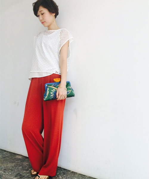 上品なとろみのあるトリアセテート素材を使用したワイドパンツ。 ブラウスと合わせて上品な着こなしもおすすめですが、今季はTシャツなどのカジュアルアイテムと合わせて生地のコントラストを楽しむのもおすすめ!