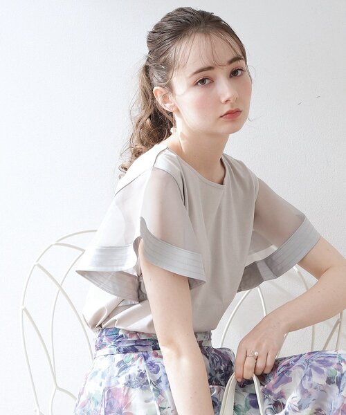 去年も人気だったお袖シアーが可愛い、フレア袖のデザインTが今年も登場! ~POINT~ 定番のオフホワイト・ブラックに加え、今年は使いやすいグレーとモカピンクを追加しました。 二の腕をふんわりカバーしながら、こなれ感をプラスしてくれる華やかなTシャツです。 裾にはスリットが入っているので、パンツスタイルでインせず着ても◎ カジュアルにデニムスタイルから、オフィスカジュアルにスカート合わせもOK。 【素材・機能】 程よい肉感ときれいな面感が特徴的な50シルケットスムース素材を使用。 袖の部分にはふんわり透け感のあるオーガンジー素材とサテン素材をドッキング。 ※マシンウォッシャブル、UVケア(本体のみ)接触冷感機能付き ※この製品は、太陽光線中の紫外線(UV)を通しにくくします。この効果は永久的ではありません。 ※照明の関係により、実際よりも色味が違って見える場合があります。また、パソコン・スマートフォンなどの環境により、若干製品と画像のカラーが異なる場合もございます。 【スタッフコメント】 ・maki(163 ) さらっと肌触りのよいTシャツ生地は接触冷感機能付きなので、ほんのりひんやり感じます◎ 色が入ったカラーは、特に透けにくく感じられるのでインナーにも悩まなくてよさそう! 普通のTシャツだと以外と着こなしが難しいので、華やかデザインTシャツは一枚でキマっておすすめです。 【24SS NEW ARRIVAL】 【24SS NEW COLLECTION】 店舗へのお問い合わせ商品番号:508-18513 ●製品寸法: 36(S):着丈前53cm 着丈後57cm B92cm 袖丈14cm 肩幅39cm 38(M):着丈前54cm 着丈後58cm B96cm 袖丈15cm 肩幅40cm 40(L):着丈前55cm 着丈後59cm B100cm 袖丈15cm 肩幅41cm 42(LL):着丈前56cm 着丈後60cm B104cm 袖丈16cm 肩幅42cm 備考: