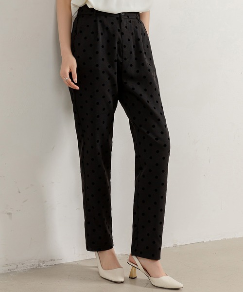 レディース テーパードパンツ 「甘すぎない大人な雰囲気」 フロッキー“ドット”パンツ FLOCKY DOT TAPERED PANTS S M L ◆アイテムのお気に入り登録◆ ハートマークをクリックしてお気に入り登録しておくと、 本アイテムが“あなただけのタイムセール”候補になります! 他にも本アイテムのプライスダウン情報・再入荷・ラスト1点など いち早くお得な通知を受け取ることができます! ■甘すぎない大人のドット柄オン・オフ活躍するテーパードパンツ ふわっと表面変化のあるフロッキードットがポイントの テーパードパンツは、プラスするだけで品の良い華やかさを演出。 黒地に黒のドット柄で甘すぎず、スッキリとしたシルエットの テーパードパンツなのでオン・オフ問わず着こなせます。 【Fabric】 さらさらな手触りのツルっとした生地 【Detail】デザイン性も機能性も充実 ■ボタン・ファスナー付きゴムウエスト 後ろは楽々なウエストゴムで前はボタン&ファスナー付きのフラットなウエストデザインなので タックインコーデの際も綺麗なシルエットに仕上がります。 ■ウエストの微調整も可能ベルトループ付き ベルトループがついているのでベルトでサイズの微調節も可能◎ ■便利に使えるポケット付き 両サイドには、スマホやハンカチ等を入れることができるポケット付き。 【MODEL】 size : M 164cm/47kg B:81/W:62/H:88 【商品仕様】 ・生地の厚さ:薄手 ・透け感:なし ・ストレッチ:なし ・裏地:なし 【セット内容】 ・1点 ・ボトムス ◆ブランドのお気に入り追加◆ セールやクーポン配布情報/新作アイテムの入荷/ショップニュースなど ブランドの最新情報を受け取ることができます。 Instagram > @day_closet1203 tiktok > @daycloset.official ●サイズは平置きで測定しております。 ※サイズは、実寸サイズを測っているため多少誤差がでる場合があります。 製造工程の関係上、各採寸箇所実寸(平置き)より【約-3cm~+3cm】程度は 誤差の許容範囲とさせて頂いておりますので、予めご了承くださいませ。 ●商品・着用者によっては多少の誤差がある場合がございます。 ●商品のお色は、照明の関係で実物と多少の違いが生じることがございます。ご了承ください。 ●生地の取り方により、柄の位置等写真と異なる場合がございます。ご了承ください。