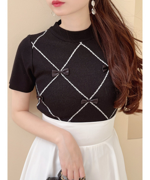 身頃に散らしたサテンリボンが今季らしいニットトップス。ダイヤ柄をプラスし上品で華やかな印象に。 コンパクトな形でメリハリのあるシルエットに導きます♪ニット素材なので伸縮性もあり着心地も抜群です。 短めの丈感ですっきりと見せてくれ、重心がアップしてスタイルアップして見せてくれます。 ワイドパンツやフレアスカートのふわっとしたシルエットのボトムにも、タイトスカートやスキニーなどぴたっとシルエットのボトムにも合わせやすいので1枚持っていると様々な雰囲気での着こなしがお楽しみいただけます。