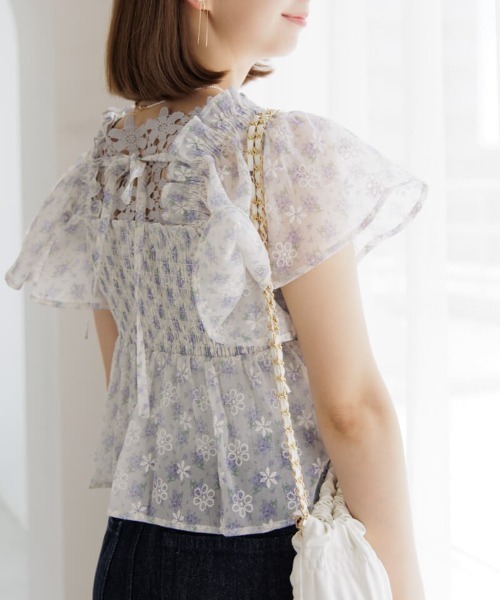 ■デザインこちらの商品は2024 SPRING / SUMMER COLLECTION LOOK掲載アイテムです。繊細なタッチの花柄生地に刺繍が施された、夏の空気を感じさせてくれるブラウス♡華やかな素材とメリハリのあるディテールが大人可愛い一枚です。ほんのり透け感のあるシアー素材なので、フェミニンで上品な印象を演出します。二の腕をカバーしてすっきり見せてくれるほどよいボリューム感の袖口♪胸元のシャーリングとスクエアネックが女性らしさを演出してくれるポイントです。高めのウエスト切り替えと、裾に向かって広がるフレアシルエットでスタイルアップ効果も◎デイリー使いだけでなく、イベントやデートなどの特別なお出かけにもぴったりな一枚です。デザインフルで華やかなブラウスなので、ボトムにはglad buggy pantsやstep fringe pants2などカジュアル素材のアイテムがおすすめです。■flower/フラワー「love&joy」をコンセプトに、商品に愛を込め、お客様に楽しんでいただけるような、ナチュラルでガーリーなアイテムを提案していきます。【お買い物を上手にお楽しみいただくためのPOINT2つ】◎ 購入ボタン横の ♡ (ハートマーク)をクリック! 完売カラーの再入荷通知、残り1点の通知、セールの通知を受け取れます。 (クリックまたはタップで商品のお気に入り登録♪)◎ ショップのトップページにある ♡ (ハートマーク)「お気に入りショップに追加」をクリック! 新商品や再入荷等、いち早くブランドのお得な情報を受け取れます。 (ブランドのお気に入り登録♪)