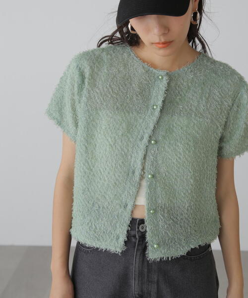 (fabric&design)ふわっと毛足の長いジャガード素材で仕上げた、トレンド感バツグンな映えブラウス。見た目はふわっとしていますが、シアー素材のブラウスなので夏も涼しげに着用いただけます。(styling)デニムパンツやカーゴなどのカジュアルなボトムスにも合わせられるように、Tシャツ型のシンプルな形で仕上げました。前開きで羽織っても、前を閉めてトップスとしても着られる万能なアイテムです。■透け感:ややあり■生地の厚さ:薄手■裏地:なし■伸縮性:なし■光沢:なし■シルエット:スモールmodel:骨格ストレート---------------------------------------------------◆商品のお気に入り登録◆お気に入りアイテムの値下げ・再入荷・在庫1点などの通知を受け取ることができます。◆ブランドのお気に入り登録◆新商品や再入荷、セール、クーポン配布などお得な情報を受け取ることができます。---------------------------------------------------