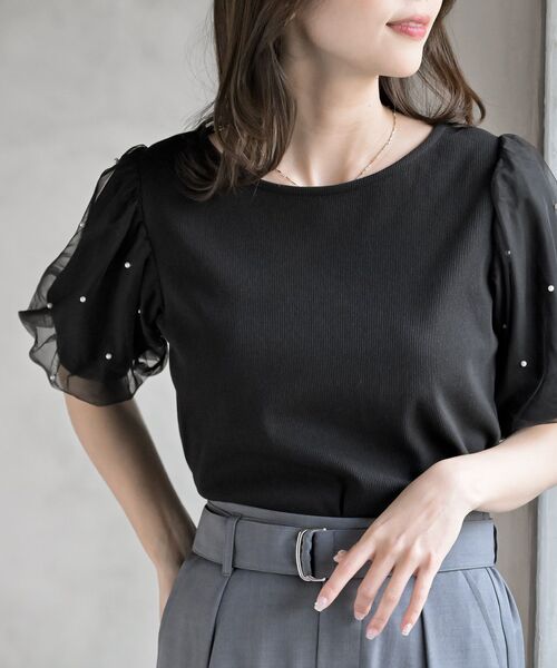 ☆2026/SS 再入荷☆ 上品に装うパール袖トップス 袖にちりばめたパールが上品な華やかさを演出するトップス。 ふわっと膨らむチュールの袖が大人可愛いを叶えてくれます。 身頃はストレッチ性のあるリブカットソー。 コンパクトな身頃シルエットながらストレスなくご着用いただける1枚になっています。 またボリューミーな袖とのバランスも◎。 着るだけで好感度の上がるフェミニンなアイテムです。 ※再入荷の場合、生産時期が異なるため色・素材・サイズ・デザイン等多少異なる場合がございますので予めご了承ください 裏地なし 伸縮性弱 薄手 パールは金具で留めてあるため強い負荷がかかると破損する恐れがございますのでご注意ください 洗濯:手洗い可 ▼お気に入り登録でお得がいっぱい▼ ~商品をお気に入り登録~ 再入荷・ラスト1点などの通知を受け取ることができます! ~ブランドをお気に入り登録~ 《rps》の新商品・再入荷情報をいち早くお届け!
