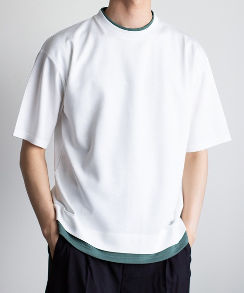 軽く柔らかくしわになりにくいダンボールニット素材を使用した、フェイクレイヤードTEE。 織りが細かく乾きも早い機能的な生地。 モードライクでしっとりとした素材感を2枚重ねたように縫製し差し色を加えました。 程よいゆとりと厚みで体型を目立たせず、どんな方でも美しいドレープ感を楽しめます。 こちらの商品はセレクトアイテムです。