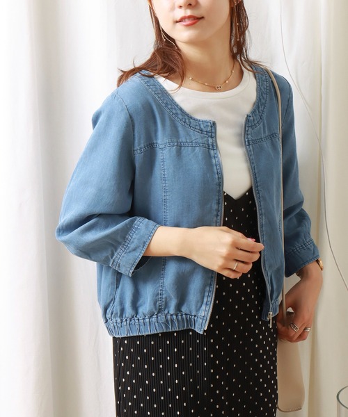 着心地の良い柔らかさが魅力! 環境にも優しいデニムブルゾンです◎ ■point ・エコな素材を使用 ・ノーカラー ・程よい光沢感 ・コンパクトな着丈 ■detail スッキリときれいめ見えするデニムブルゾンです。 ノーカラーデザインなので、カジュアルになりすぎず女性らしい雰囲気に。 裾はゴム仕様なのでコンパクトな着丈です。 背中部分にはたっぷりギャザーが入っているので、 身体のラインを拾いすぎず、すっきり着て頂けます。 ■fabric 環境に優しい再生繊維(セルロース)を使用。 繊維が柔らかく、美しいドレープ感、光沢感があり 吸水性・速乾性に優れたエコ素材です◎ …………………… 透け感:なし 厚さ:薄い 裏 地:なし 光沢感:ややあり 伸縮性:なし ポケット:なし 洗濯方法:手洗い …………………… ※ネットに入れてのお洗濯をお勧めいたします。 ※詳しいお手入れ方法は商品タグをご参照ください。 ■coordinate コンパクトな着丈を活かして、ワンピースの上から羽織ったり、 マーメイドスカートやフレアスカートとの組み合わせがオススメ。 もちろんワイドパンツなどカジュアルなアイテムとも相性ばっちりです◎ 《商品のお気に入り登録》 ・再入荷通知や、ラスト1点の通知、セール通知も受け取ることができます。 《ブランドのお気に入り登録》 ・新商品や再入荷など、お得な情報を受け取ることができます。 ※屋外の光や照明の当たり具合、パソコンなどの閲覧環境によって 実際の色味と異なって見える場合がございます。 予めご了承ください。 ※他のキャンペーンにより、期間中に価格が変動する場合があります。