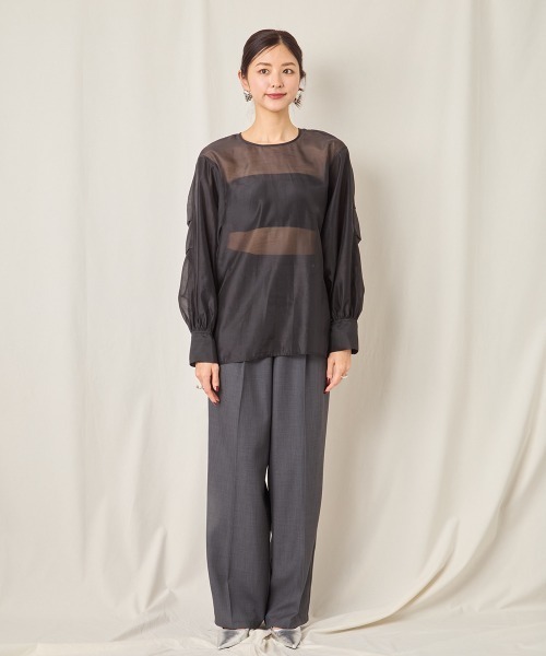 ■コメント■大人の透け感楽しめるボリュームトップス。甘くなりすぎないようなお袖のバランスにこだわりました。アクセントありながらも、ファッション感度高い1着で、いつものスタイリングに差し込むだけで存在感を出してくれます。■スタイリング■INしてもOUTしても使いやすい丈感でデニムやスカート、何にでも合わせやすい1着です。お袖のボリュームが特徴で、ベストやジレ、オールインワンなどのレイヤードアイテムとも相性抜群です。■骨格タイプコメント■ストレートタイプ▼基本的にシアー素材の物があまり得意ではないストレートタイプさんでも、こちらの商品はハリのある素材感なので挑戦しやすいアイテム!カラーはドレッシーな印象の黒がストレートタイプさんによくお似合いになります。ボトムスはデニムなどでカジュアルダウンすることで、よりこなれた印象に。ウェーブタイプ▼シフォン素材素材の物や透け感のあるものが非常に似合うウェーブタイプさんにおすすめのトップス。ボトムスはハイウエストの物を合わせることで更にバランスよく着こなしていただけます!上半身に重心をもたせるために、靴は厚底などは避けてサンダルや細めのヒールの物などと合わせるのがおすすめ。ナチュラルタイプ▼ゆるっとしたシルエットの物をとてもオシャレに着こなすことが出来るナチュラルタイプさん。ふんわりとした素材が、ナチュラルタイプさん特有の骨感をカバー!ボトムはメンズライクなものを選んできれいめカジュアルなスタイリングがおすすめです。★商品のお気に入り登録 登録すると、完売しても再入荷時に通知を受け取ることができます。 ほかにもお得な特典があるかもしれません♪ ★ブランドのお気に入り登録 新商品や再入荷などの情報を受け取ることができますので、是非ご登録ください♪