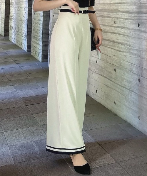 ■デザインポイントシーズンムード漂うバイカラーのデザインが目を引くパンツ。裾のレトロな配色使いやラインとお揃いの配色ベルトがメリハリをつけ、コーデを引き締めてくれます。すっきりとしたワイドシルエットとセンタープレスの入ったデザインが美脚効果も…■オススメスタイリングボウタイシャツと合わせてパリジェンヌのようにフレンチな着こなしにピッタリの一品です。夏はさらっとTシャツに合わせて着こなすのも◎マリンムード漂うネイビーのジャケットとセットアップでも着こなせます。※アイロンは当て布を使用してください。▼商品のお気に入り登録▼気になるアイテムの♡をクリックしてお気に入り登録すると残り1点の通知、完売カラーアイテム再入荷の通知、お得な通知が届きます。▼ショップお気に入り登録▼ショップからの新作商品やお得なイベント情報など、いち早くブランドからの情報を受け取ることができます。
