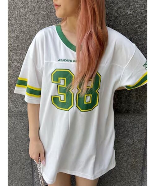 【池田美優さんコラボアイテム】程よく透かしの入ったメッシュ生地を使用したBIGTシャツ。全体的に大きめのサイズ感なのでミニワンピ風にも着用できます。カジュアルな雰囲気のTシャツですが首元は程よく開けているので、女性らしく着用できます。リブワンピースの上から着用するスタイリングもおすすめです。ロゴの意味:38=みちょぱ