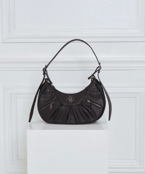 タックが入り、スタッズやファスナーを付けたデザインのショルダーバッグ。紐を短くして片方の肩に掛けたり、紐を伸ばして斜め掛けすることもできる便利な2WAY仕様です。