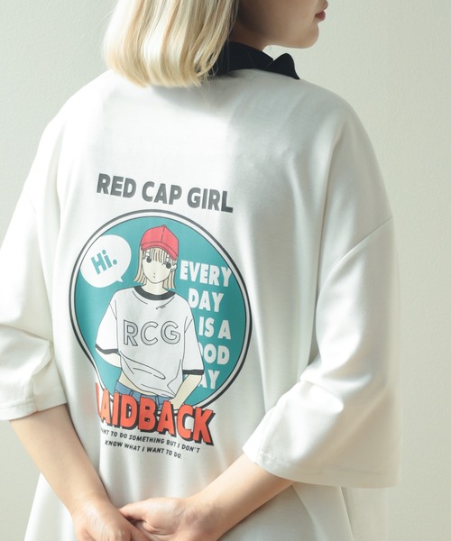 【Red Cap Girl/レッドキャップガール】ワンポイント刺繍&バックBIGガールイラストデザイン ポンチ半袖ハーフジップ/ビッグシルエット/接触冷感