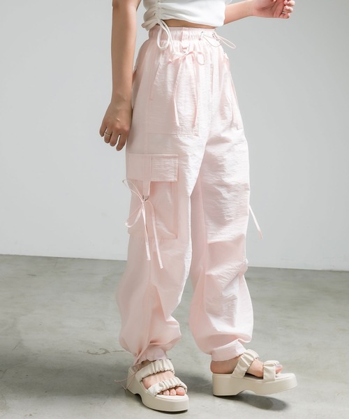 映えも甘さもマシマシなカーゴパンツ■デザイン・リボンチャームがポイントの女みデザインなカーゴパンツ。・膝にタックが入って動きやすい仕様に。機能性も兼ね備えたデザインが魅力。・使いやすいベーシックなオフ/ブラック、ガーリーな印象の花柄やピンクのカラーバリエーション。・ウエストと裾をドローコードを調節でき、楽な着心地です。・1枚で様になりロングシーズン使えるアイテムです。■カラー・オフ/花柄/ピンク/ブラックの4色展開■スタイリング・コンパクトなサイズ感のTシャツやニットがおすすめ。・カップ付きキャミソールにカーディガンを羽織れば大人カジュアルなスタイルに。・ボリュームのあるスポーツサンダルや厚底スニーカーとの相性◎-------------------------------裏地:オフ/ピンクあり、花柄/ブラックなし光沢感:なし(ピンクややあり)透け感:なし(オフややあり)伸縮性:なし手洗い: 可能(花柄40℃を限度とした非常に弱い洗濯)タンブラー乾燥: 不可アイロン: オフ/ブラック110℃まで、花柄150℃まで、ピンク不可-------------------------------model:163cm/166cm■お気に入り登録のおすすめ【気になるアイテムを登録】ハートをクリックしてお気に入りに登録すると完売カラーの再入荷やラスト1点の通知、セールの通知を受けとることができます。【ブランドを登録】新商品や再入荷、セール通知など、いち早くブランドの情報を受けとることができます。