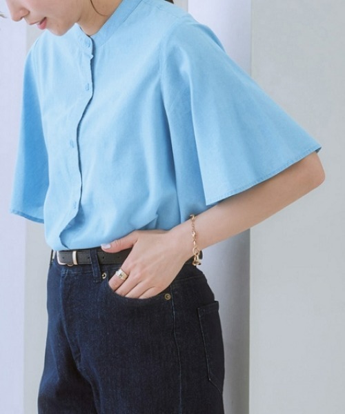 ◆夏の通勤を快適に!高機能素材のきちんとブラウス■デザインクリーンな印象のスタンドカラーにボリューム感のあるフレア袖デザインで着映えるブラウス■素材綿混のふんわりした薄手素材に接触冷感・吸汗速乾・UVカット機能がついているので夏を快適にしてくれそうな一枚ネットに入れて洗濯機OKとイージーケア機能付なのでお手入れもらくちん■おすすめのスタイリングお仕事向けキレイ目ボトム合わせにも休日のデニム合わせにもピッタリで幅広く着まわせるブラウスです【働く服改革】働く女性の声に寄り添い、商品やコンテンツを通して「働く服・働き方改革をサポートしたい」「働く女性同士が気軽にコミュニケーションを図れる場を提供したい」そんな想いでスタートしたブランドです。<仕様>【サックス無地】綿60%・レーヨン25%・ポリエステル15%【その他】ポリエステル55%・綿25%・レーヨン20%(織物)透け感:ややあり伸縮性:なし生地の厚み:薄手光沢感:なし裏地:なしポケット:なし季節:初夏・夏・初秋シルエット:普通<洗濯方法>洗濯機OK ネット使用■キーワードシャツ、トップス、ファッション、ブラウス、レディース、夏、ビジカジ、オフィスカジュアル、レディス、アパレル、お仕事、通勤、テレワーク、入学、卒業、学校行事、懇親会、顔合わせ