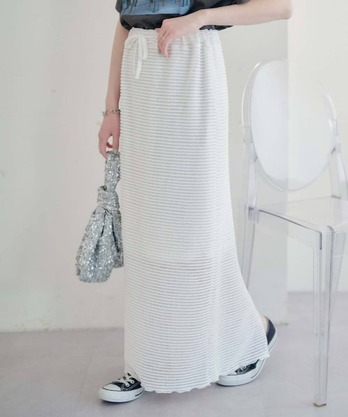 程よいフリルで大人かわいいが叶う!伸縮性のある素材で細見えするスカート■デザイン程よいフリルが甘すぎず、着回ししやすいスカートが登場!ウエストが総ゴム仕様で、伸縮性も抜群なのでストレスフリーな着心地◎身体のラインを拾いすぎず、綺麗なIラインシルエットでスッキリ見えも叶います。バックスリット入りなので、足さばきの良さも嬉しいポイント♩合わせるアイテム次第では、ロングシーズン着用いただけます!■スタイリングロゴTEEやシャツなどと合わせるのはもちろん、腰回りが気になる方はオーバーサイズなトップスで、ゆるっとスタイリングがおすすめ!足元は華奢なサンダルはもちろん、スニーカーでカジュアルダウンも◎■お手入れ方法洗濯:裏返してから洗濯ネットを使用し、洗濯機の手洗いモード可(単独洗い)タンブル乾燥:不可アイロン:あて布を使用し、110℃まで可※実際の商品は裏地が10㎝程長い仕様となっております。 伴ってスリットも7㎝程浅くなります。・・・・・・・・・・・・・・・・・・・・・・透け感:裏地なし部分あり裏地:あり伸縮性:あり光沢感:なし生地の厚さ:薄手・・・・・・・・・・・・・・・・・・・・・・▼気になる商品を登録ハートをクリックして《お気に入り登録》がオススメです!セール情報や完売カラーの再入荷通知、ラスト1点の通知などを受け取ることができます!▼ブランド新商品や再入荷など、ブランド情報をいち早く受け取ることができます! ※画像の商品はサンプルを使用しております。実際の商品と若干の仕様が変更になる場合がございますので、予めご了承の上ご注文くださいますようお願いいたします。