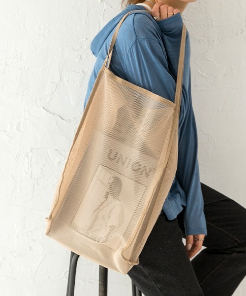 編み目から中身が透ける、メッシュ素材のトートバッグ! 中にはA4雑誌サイズはもちろん、小旅行にも使えるほどの大容量 ナチュラルで、アンニュイな雰囲気で、持ち歩きのサブバックにもぴったり! スーパーでお買い物の時、エコバッグ用 プールやビーチへお出かけ用などいろいろな場面で使えるとても便利◎ 素材、色味について 裁断によって、模様の配置が写真と多少異なる場合があります 撮影時のライティング、モニター・PC環境により色味が異なって見える場合がございます 商品画像と実物では多少色味に違いがございますので、予めご了承下さい 輸送時や梱包による、多少のシワがある場合がございます ご了承の上お買い求め下さい 【お取り扱い上のご注意】 ・この製品は生地の特性上、洗濯によって多少縮む場合がございますので、ご注意下さい ・蛍光増白剤の入っていない洗剤を使用して下さい ・水洗いで移染しやすいので、他のものと分けて洗って下さい ・濡れたまま重ねたり、丸めたりしないで、形を整えて直ぐに干して下さい ・濃色のものは染料の性質上、擦られると色移りすることがありますのでご注意下さい ・汗や雨で湿った場合、着用中の摩擦により他の物に色が移る場合があります ・洗濯後に多少の型くずれ、斜行(製品がねじれて見える状態)が起きますので、あらかじめご了承下さい ・タンブラー乾燥の際は、製品を傷める恐れがありますので、お取り扱いには充分ご注意ください 【注意事項】 商品をお安く提供させて頂く為、検品後のアイロン掛けは省略させて頂いております 簡易梱包の為、たたみ皺があると思いますが、ご了承ください 海外輸入品の為、商品の細部仕様は予告なく変更になる場合がございます