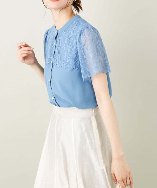 ◆人気のレースヨークブラウスが今年も登場◆ 【デザイン】 ・大人気のレースヨークブラウスの半袖バージョンが登場 ・今季はキレイなブルーが新色で追加 ・丸型パール釦からハーフ釦に変更し ウエストインした時に目立たないようにブラッシュアップ ・大人も着やすい甘すぎないレース使いに拘った一枚 ・一枚でスタイリングがぐっと華やかになるアイテム ・インもアウトも決まる着丈設定 ・お出かけから通勤までシーンレスで使える 【素材】 ・レース部分はナイロンポリウレタン素材で程よい伸縮性 ・身頃はさらっとしたポリエステル素材 【コーディネート】 きれい目のボトムと合わせた通勤スタイルや、 スカートと合わせたフェミニンなスタイリングが◎ カジュアルなデニムと合わせたミックススタイルもおすすめ。 -------------------- 透け感:アイボリーのみややあり 裏地:なし 伸縮性:レース部分ややあり 光沢感:なし 生地の厚さ:薄手 -------------------- ≪お気に入り登録機能の使い方≫ ■商品のお気に入り登録(ハートマークをクリック) 再入荷通知や値下げ等、お得なご案内を受けることができます。 -------------------- ※商品画像は、光の当たり具合やパソコンなどの閲覧環境により 実際の色味と異なって見える場合がございます。 商品の色味の目安は商品単体の画像をご参照ください。 ※34(XSサイズ)・42(XLサイズ)はWEB・一部限定店舗での販売です。