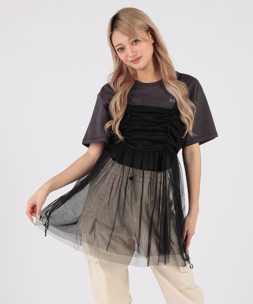 ふんわりとしたシルエットのキャミソールチュニック。透け感が特徴のチュール素材を使用し、シアーなレイヤードが楽しめる1枚です。後はリボンでバックスタイルもポイントに◎Tシャツやタンクトップ、シャツなどに重ねるだけでトレンドライクなスタイルが完成します。