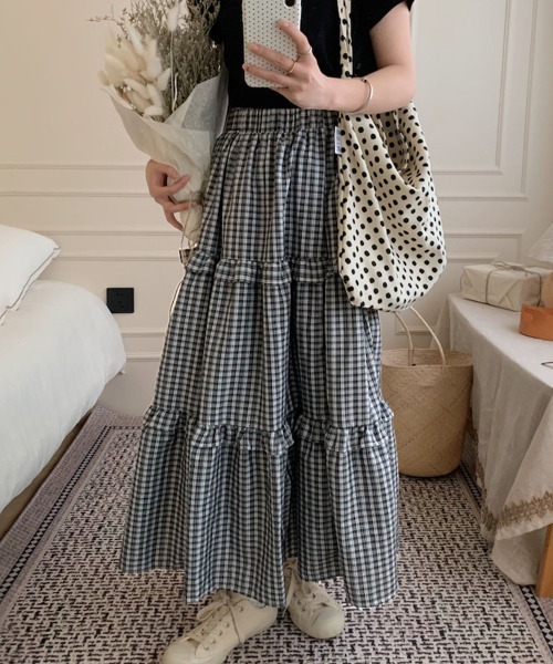 オトナガーリーさん必見♡夏服チェック柄ティアードスカートレトロなチェック柄にフリルがついたオトナガーリーなスカートが登場。ボリューミーなふわっとシルエットが無邪気さあるデザインでかわいく着映えします♡ウエストはぐるっと1周のゴム仕様で履き心地◎トップスをインしてもきれいに決まります♪身体に貼り付きにくいシャカっとした軽い生地で、春夏スタートにぴったりな1枚です。■生地感:若干薄手■伸縮性:なし■透け感:なし■裏地:あり(膝丈)■ポケット:なし※平置き採寸になります。若干の誤差が生じる場合がございます。※輸送時による、多少の汚れ・シワがある場合がございます。※撮影時のライティング、ご覧になっているモニター・PC環境により実際の商品と色味が異なって見える場合がございます。ご了承の上お買い求め下さい。