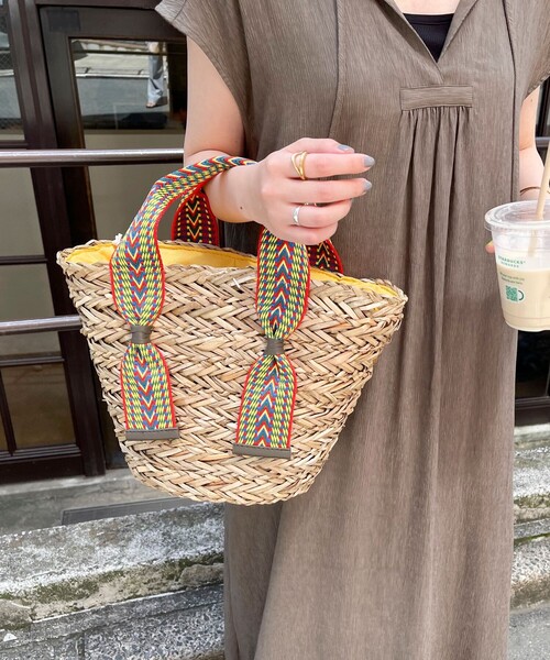 ◇fredy emue◇【2024 SS】スタイリングのポイント使いに最適なジャガードテープカゴバッグ●point・ジャガードテープが目を惹くカゴバッグです・鮮やかなカラーがポイントの1点持つだけでコーデのアクセントとなるアイテムです・明るいジャガードテープとカゴバッグの素材が春夏の季節感を演出してくれます・500mlのペットボトルが入り、お出かけに必要な荷物はしっかり入るサイズ感◎・バッグの口は巾着仕様で中身が見えず安心です・持つだけでパッと明るくなるかごバッグはこの春夏に持っておきたい1点です《収納の目安》・500mlペットボトル・長財布・日傘・ポーチ・スマートフォン●お取扱い上のご注意●*アテンションタグを必ずご確認の上、着用又はお取り扱い下さい。*店頭及び屋外での撮影画像は、光の当たり具合で色味が違って見える場合があります。商品の色味は、スタジオ撮影の画像をご参照下さい。*商品画像に関しては出来る限り忠実に表示出来るよう努めておりますが、お客様がご利用のモニターの設定及び特性により、実際の商品と比較し色味に若干の誤差が生じる場合があります。◇商品のお気に入り登録◇【お気に入りに登録 ♡マークをクリック】を是非ご活用ください! 再入荷の通知や、ラスト1点の通知、セールの通知がいち早く届きます。◇ブランドのお気に入り登録◇新商品や再入荷など、いち早くブランドのお得情報が届きます。