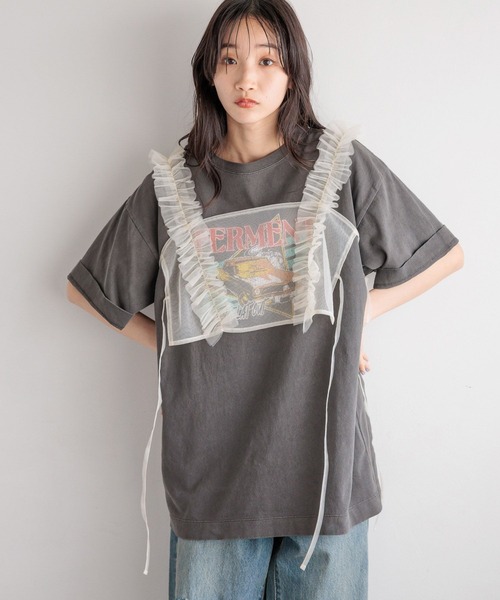 ■デザイン■ アクセ感覚で使えるチュールビスチェ。 Tシャツの上から付けるだけで今年らしいスタイリングに。 サイドの紐はスタイリングに合わせて結んでも、垂らしてもご使用いただけます。