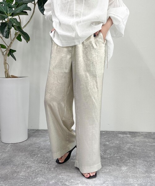 ◇fredy emue◇【2024 SS】キラキラが目を惹くシャイニーイージーパンツ●point・光沢感のある軽い素材のイージーパンツです・程よい箔感が今年っぽいアイテム・シルエットはセミワイド型のイージーなので涼しく夏までずっと履けるアイテムです・ゆったりシルエットでリラックス感のある着心地◎・ウエストはゴム仕様でサイドにあるリボンで調整していただけます・裏地付きで柔らかい肌触りも嬉しいポイント・コーデのアクセントになるボトムなのでシンプルなトップスやブラウスと相性◎・履くだけでパッとコーデが明るくなるアイテムです透け感:なし裏地:膝上あたりまであり伸縮性:なし光沢感:あり洗濯:手洗い可●お取扱い上のご注意●*商品を長くご愛用していただきたいため、アテンションタグがある場合は必ずご確認の上、着用又はお取り扱い下さい。*画像の商品はサンプルとなりますので実際の商品と仕様(主にファスナー・釦等の付属品)、加工、サイズが若干異なる場合がございます。*店頭及び屋外での撮影画像は、光の当たり具合で色味が違って見える場合があります。商品の色味は、スタジオ撮影の画像をご参照下さい。*商品画像に関しては出来る限り忠実に表示出来るよう努めておりますが、お客様がご利用のモニターの設定及び特性により、実際の商品と比較し色味に若干の誤差が生じる場合があります。*製品洗い加工の商品は、多少の歪み、シワなどが見られたり、風合いやサイズ等が1枚1枚異なります。汗や雨等で濡れた時や、摩擦により色落ちし、他の衣料を汚すことがありますので(特に濃色のもの)ご注意ください。◇商品のお気に入り登録◇【お気に入りに登録 ♡マークをクリック】を是非ご活用ください! 再入荷の通知や、ラスト1点の通知、セールの通知がいち早く届きます。◇ブランドのお気に入り登録◇新商品や再入荷など、いち早くブランドのお得情報が届きます。