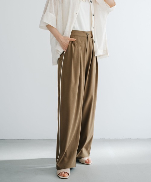 ★新作アイテム★【着心地の良いドライ質感のパイピングパンツ】■商品の特徴軽くさらっとした肌触りが着心地の良いドライ質感のパイピングパンツ。サイドに配色パイピングを施していることでトレンド感+スッキリ見えの効果があります。ファスナー開きで前部分はゴムが入っていないのでよりスッキリとした印象でご着用頂けます。前面に2本のタックを入れているので、ヒップ周りは程よいゆとりのあるストレスフリーで着やすいところもポイントです。同素材のジャケットと合わせればセットアップでご着用頂けます。■生地・素材感……………………裏地:なし透け感:なし伸縮性:なし手洗い可能……………………※出来る限り実際のお色目に近くなるよう努めておりますが、 ご使用のパソコン環境によって、実物と多少異なって見える場合がございます。※生産時期により色・素材・サイズ感など多少異なる場合がございます。予めご了承ください。※セールは予告なく終了させていただく場合もあります。