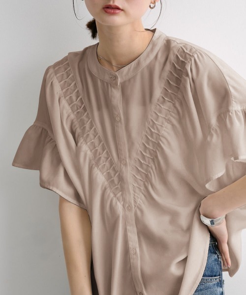 【Be praised】ーーー明日ちょっと褒められる服ーーー大人トレンドを意識したこだわりのアイテムと着こなしでアナタの毎日に輝きを。ただシンプルできれいなだけじゃ物足りない。カジュアルすぎず、スタイリッシュで大人の品性を感じる着こなしに。そんな、こなれたオシャレを楽しむ女性に寄り添う、 新鮮なリアルクローズをご提案します。■デザインドレープと落ち感が上品なブラウス。たっぷりとしたフリル袖、V字切替など表情豊かで華やかなデザイン。甘めのフリル袖とクールなバンドカラーの組み合わせが大人可愛いブラウスです■素材艶っぽくドレープと落ち感のある生地感■おすすめスタイリングデニムやテーパードパンツと合わせた大人カジュアルなコーデなど幅広い着こなしが楽しめます。<仕様>ポリエステル100%(織物)透け感:淡色はあり伸縮性:なし生地の厚み:やや薄手季節:春・夏・秋シルエット:ややゆったり<洗濯方法>手洗い■キーワードシャツ、トップス、ファッション、ブラウス、レディース、夏、通勤カジュアル、オフィスカジュアル、大人カジュアル、大人、きれいめカジュアル、きれかじ、キレカジ、20代、30代、40代、フリル