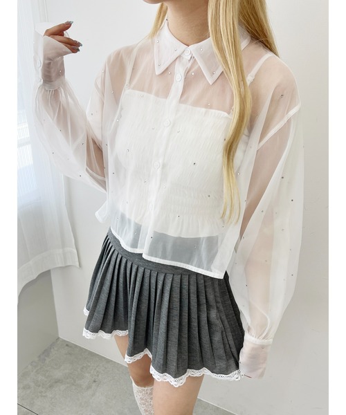 透け感のあるシアー素材にビジュー煌めく トレンドが詰まった主役級アイテムが登場!■detail&coordinateビジューが散りばめられたガーリーな印象のシアーシャツ。短めの丈感に対してゆったりとしたシルエットはスタイルアップが期待でき、こなれ感を演出してくれます。ボタンを留めてトップスとして着用するのはもちろんのこと、さらっと羽織りとしての着回しも可能!フレンチガーリースタイルにもおすすめです◎