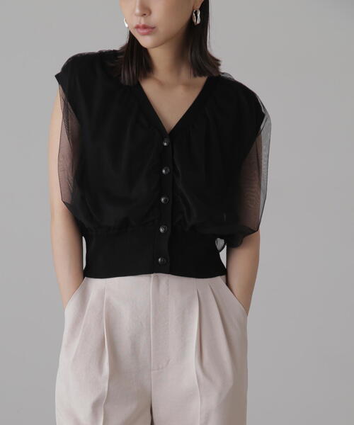 (fabric&design)さっとしたニットにチュールを重ねエアリーな雰囲気に仕上げたニットベストです。前立て部分からギャザーを挟み込みふんわりとしたフォルムを作りました。(styling)一枚着として着て頂くのは勿論、Tシャツやキャミワンピースなどに軽く羽織って頂くのもオススメです。---------------------------------------------------◆商品のお気に入り登録◆お気に入りアイテムの値下げ・再入荷・在庫1点などの通知を受け取ることができます。◆ブランドのお気に入り登録◆新商品や再入荷、セール、クーポン配布などお得な情報を受け取ることができます。---------------------------------------------------