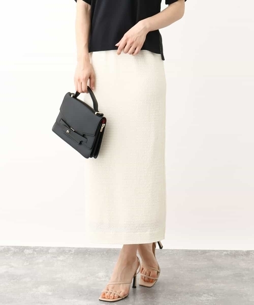 ポコポコとした素材が大人可愛い セットアップでも楽しめるナロースカート ■デザイン 素材の表面感が大人可愛いナロースカート。ウエストオールゴム仕様のストレスフリーな着心地にこだわりました。 ■素材 ポコポコとした表面感が特徴の素材は見た目以上に伸縮性抜群。さらりとした肌触りと着心地の良さが快適に着こなせるカットソー素材です。 ■コーディネート ストンとしたIラインシルエットは、腰丈のオーバーサイズのトップスと合わせたり、ジレと合わせたりと着回し力のあるアイテムです。同素材のプルオーバーとセットアップでの着こなしも楽しめます。 -------------------- 洗濯表示:手洗い可 透け感:なし(淡色はややあり) 裏地:あり 伸縮性:あり ウエスト:ゴム仕様 生地の厚さ:やや薄手 -------------------- ※自然光・照明の関係、パソコン・スマートフォンなどの環境により、実際と色味が違って見える場合がございます。予めご了承ください。商品の色味は、詳細画像をご参照ください。 ※サンプルでの撮影となるため、実際にお届けする商品と仕様やサイズが異なる場合がございます。 ▼カラー番号表記 アイボリー(80)、ブラック(94)