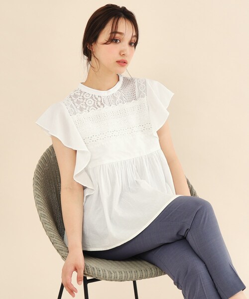 コットンローンにコットンレースを掛け合わせた袖ヒラブラウス 【素材】 ・インド産の繊細なコットン100%のローン素材を使用 ・柔らかな風合いと軽やかさが特徴 ・ハンドウォッシャブル可能なので、これからの汗ばむ季節に嬉しい機能付き。 ご自宅で簡単にお手入れしていただけます。 【デザイン】 ・インド産の繊細なコットン100%の生地を使用した軽やかなデザインブラウス。 ・スタンドカラーに、繊細な花柄や幾何学柄のコットンレースを掛け合わせたシアー感が軽やかな印象。 ・高めの位置で切替たギャザーフレアーにフレアスリーブが一枚で華やかなに決まります。 ・程良いフレアスリーブで気になる二の腕もカバーしてくれ、華奢見えが叶います。 ※照明の関係により、実際よりも色味が違って見える場合があります。また、パソコン・スマートフォンなどの環境により、若干製品と画像のカラーが異なる場合もございます。 モデル情報:身長163cm B85 W58 H92 着用サイズ:38(M) 店舗へのお問い合わせ商品番号:C58-88005 ●製品寸法: 36(S):着丈58cm B86cm 袖丈10cm 肩幅32cm 38(M):着丈59cm B90cm 袖丈11cm 肩幅33cm 備考: